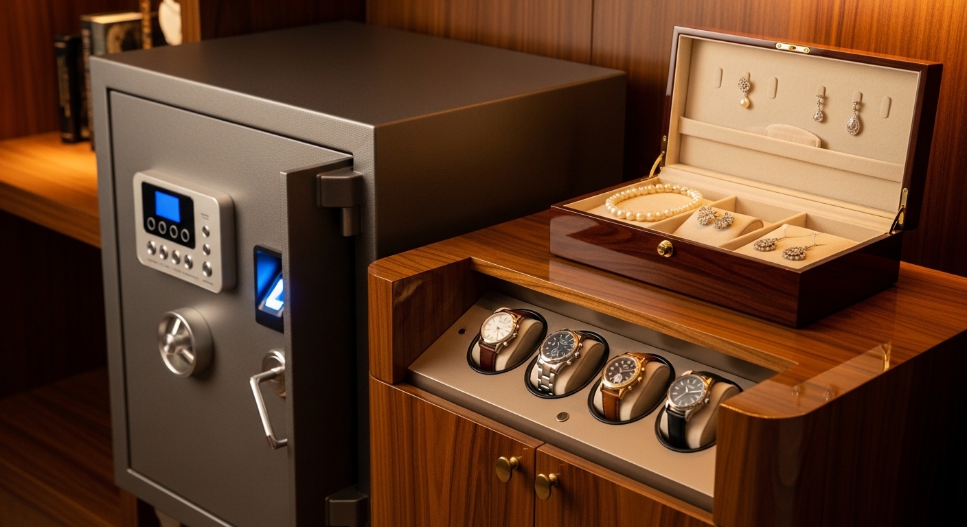 These safes combine modern security technology with elegant interior compartments for watch winders and jewelry storage.