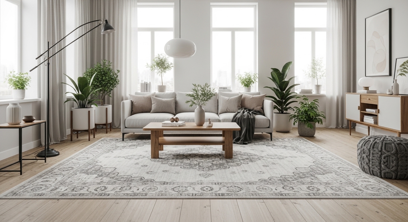Your rug should complement the furniture rather than compete with it. Neutral rugs work well with colorful furniture, while patterned rugs can enhance simple interiors.