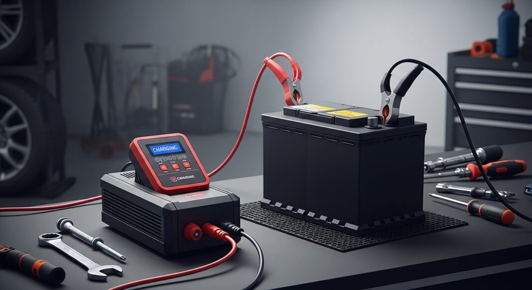 - Connect the clamps – Attach the red clamp to the positive terminal and the black clamp to the negative terminal.