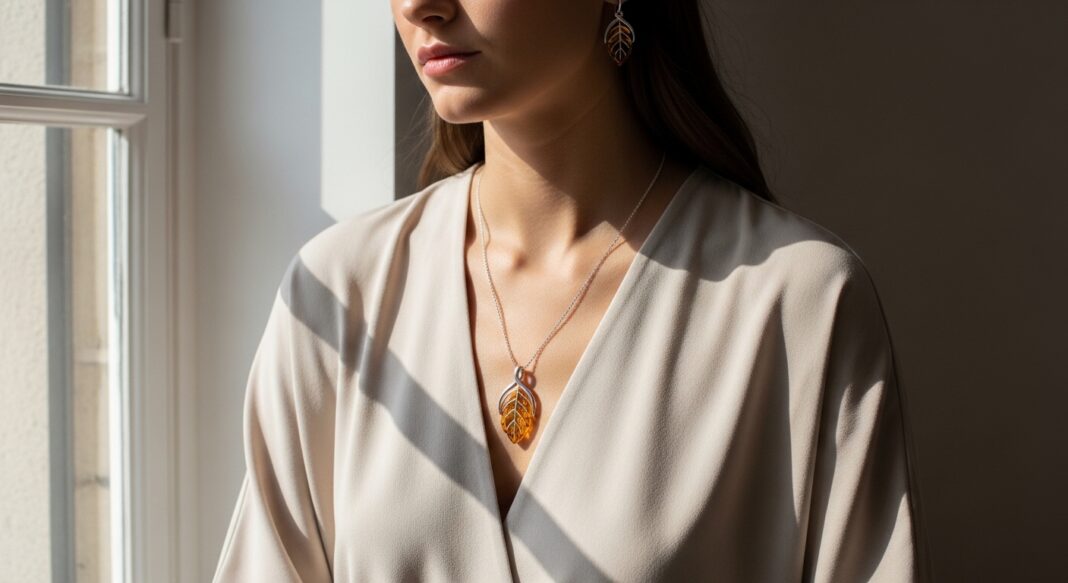 Pair a small amber pendant with a white blouse and jeans. Add simple silver studs for a clean, polished appearance. The warmth of amber softens minimal outfits beautifully.