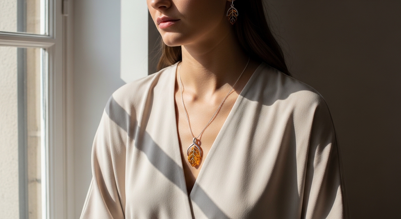 Choose a medium-sized pendant or subtle drop earrings to elevate professional attire. Amber tones complement neutral office palettes like beige, navy, and grey.