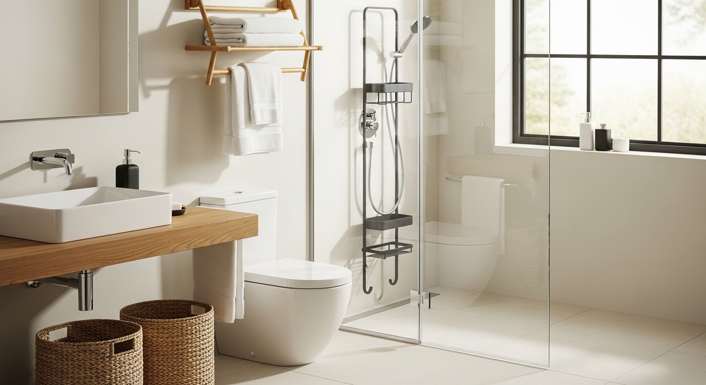 - Bathroom Accessories – Shower caddies, soap dispensers, towels racks, and toilet brushes